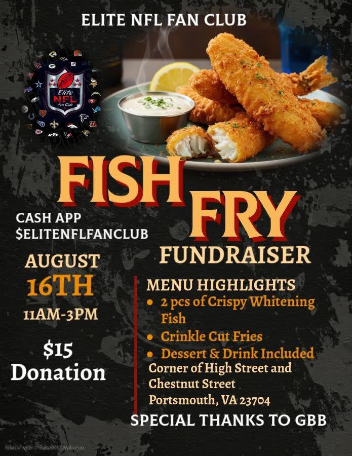 Support the Elite NFL Fan Club at their Fish Fry Fundraiser on Friday, August 16th, from 11:00 AM to 3:00 PM at the corner of High Street and Chestnut Street, Portsmouth, VA 23704. For just a $15 donation (via Cash App: $ELITENFLFANCLUB), enjoy a delicious meal featuring 2 pieces of crispy whiting fish, crinkle-cut fries, dessert, and a drink. Come hungry, support a great cause, and connect with fellow NFL fans. Special thanks to Gourmet Burger Bistro (GBB) for their continued support! Don’t miss this flavorful community event!