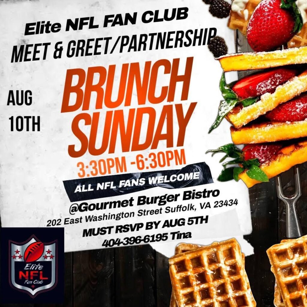 Join fellow football enthusiasts at the Elite NFL Fan Club Meet & Greet/Partnership Brunch on Sunday, August 10th, from 3:30 PM to 6:30 PM at Gourmet Burger Bistro, 202 East Washington Street, Suffolk, VA. This exciting event is open to all NFL fans and is a great opportunity to connect, network, and enjoy delicious food. Whether you’re a die-hard supporter or a casual viewer, you’re welcome to be part of this vibrant community. RSVP by August 5th by calling Tina at 404-396-6195. Don’t miss out on this game-day spirit!